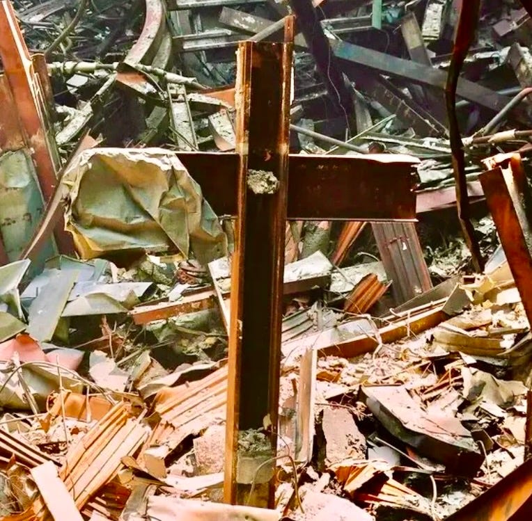 No wonder a cross of steel, forged in the destruction of the attack, was found in the rubble, [for] on the cross, Jesus turned darkness to light, sin to grace, hate to love, [and] death to life.